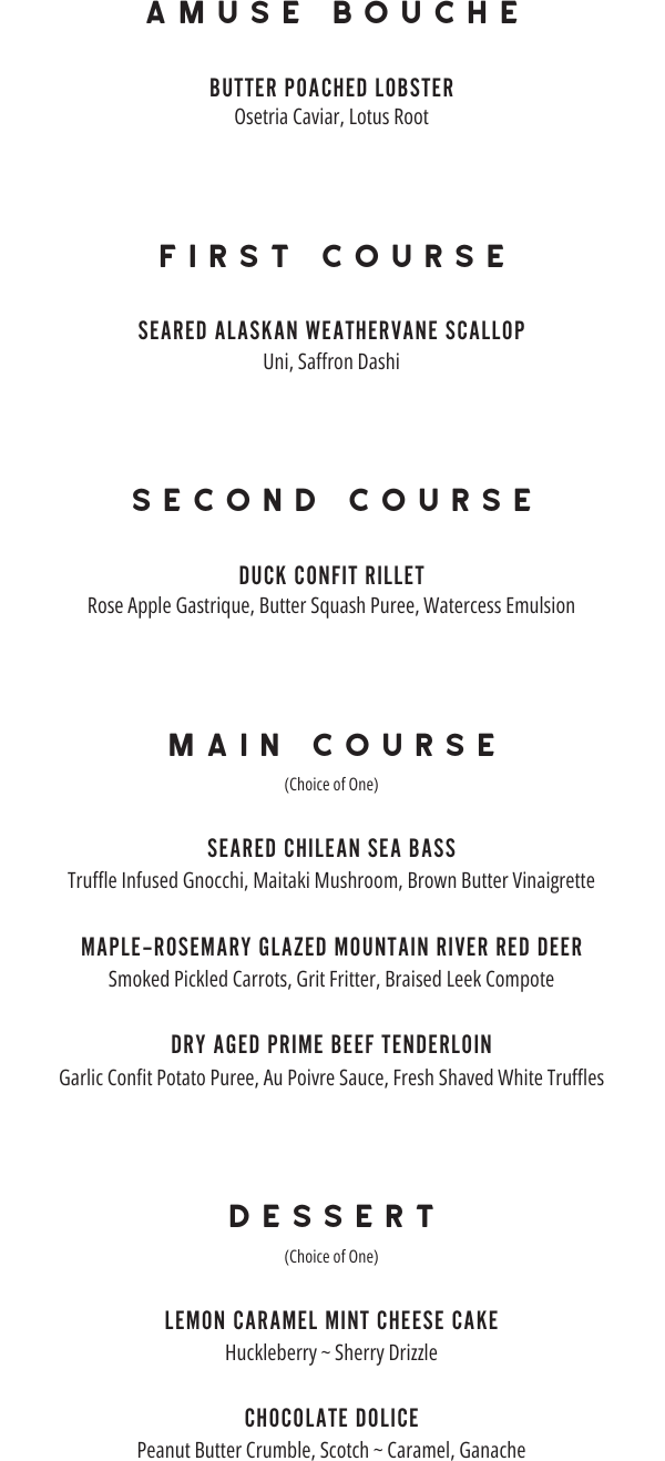 Celebrate the holidays at The Grand. Our chefs have created a special Prix Fixe menu for the occasion. Reserve Menu Menu Prix Fixe $250 / Al a Carte Menu Choices Available at the Bar / Vegetarian + Children's Menu Available Reserve Reserve *Menu subject to change based on fresh ingredient availability.